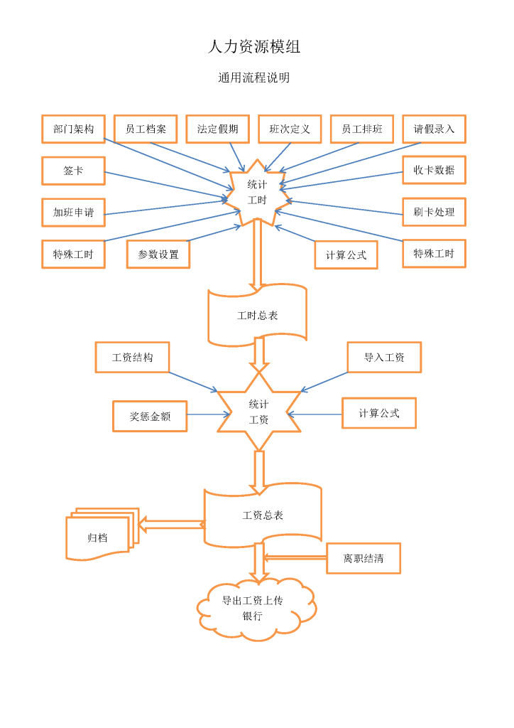 考勤管理功能包括:法定假期,班次定义,员工排班,请假录入,签卡作业,加班申请与批准,特殊工时,借调登记,刷卡处理,工时总表。其中工时总表由【统计】生成,不能人为增加和删除。