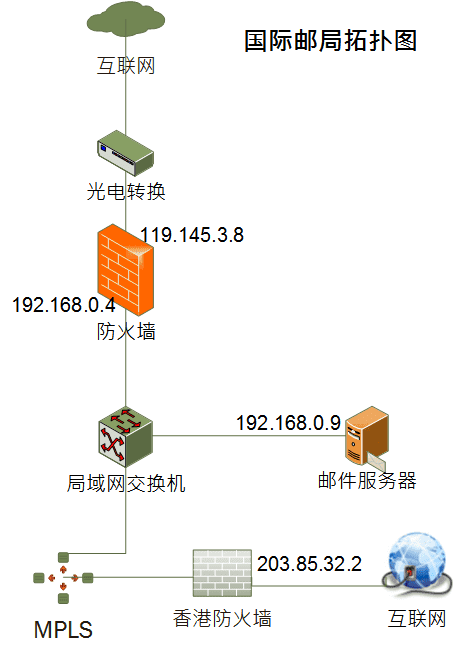- 一条国际网络专线(不走公网那种),例如MPLS。本实例是深圳公司与香港总部之间的MPLS专线。提供这种专线的ICP有中信国际电讯,香港电讯等等,价格上比中国电信的城域网宽带贵不了多少。这条专线除了给邮件服务器提供稳定的出口带宽,还可以建设VOIP,让国际电话变成内线电话,还可以做稳定的国际视频会议,还可以轻松地上国际安规认证网站申报资料,还可以做VPN,让深港两地办公室里的电脑象在同一个局域网里一样便捷访问,等等。这是本方案唯一要增加的成本,但收益也很大。