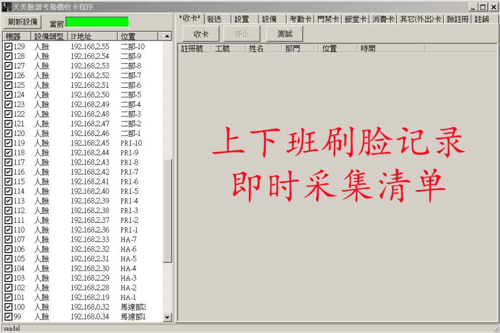 刷卡设备可以按不同功能(考勤,门禁,饭堂,消费)来分类,采集的数据分别存于不同数据表中。支持指ID卡,脸谱及混合刷卡。
